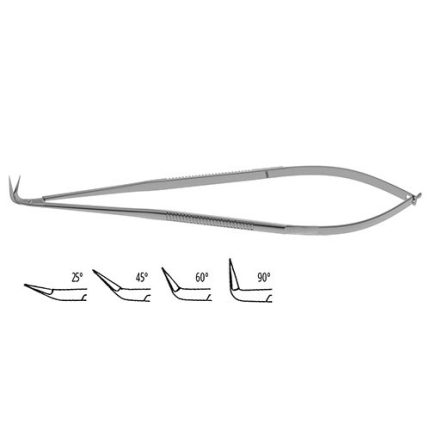 Jacobson Micro Vascular Scissors are designed for use in cardiothoracic surgical procedures, such as for performing arteriotomy on exceptionally small vessels. This scissor features a flat handle for ease in handles as well as blades angled off this handle making it easier to access some vasculature and makes this instrument particularly well suited for small vessels. Additionally, this instrument is available in four different angle measures: 25, 45, 60 and 90 degrees, increasing the functionality of this scissor in micro surgical procedures.