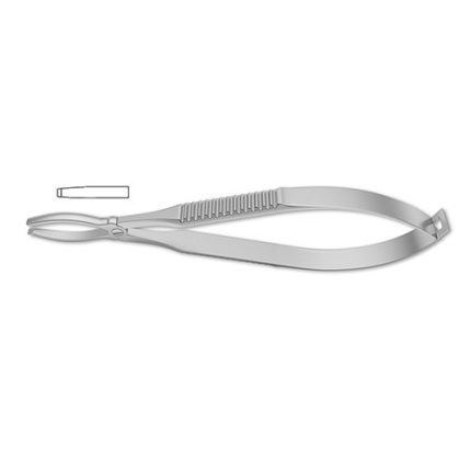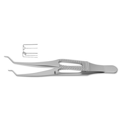 colibri style, 1x2 teeth, 45 degree angle, slightly overlapping, 3" (7.6 cm)?Harms Corneal Utility Forcep is a specialized tool designed for handling corneal tissue during ophthalmologic procedures. The delicate 1x2 teeth provide a firm yet atraumatic grip to the delicate corneal epithelium during surgery or cornea-scleral suturing. The ribbed handle with finger hole allows the surgeon to adjust grip for maximum control.