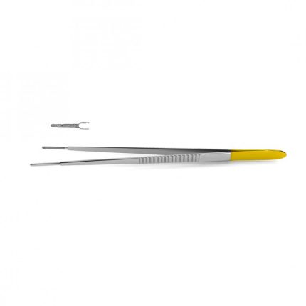 Evans Tissue Forceps are handcrafted from tungsten carbide for a durable and strong instrument with a crosshatched surface to provide a secure grip. Designed with a dissecting end and a long instrument length, this model assures that while dissecting or manipulation tissue the surgeon will have both a firm grip as well as an open visual field. Tungsten carbide forceps feature tips made from tungsten carbide, the hardest metal made for surgical instruments. Precision-milled serrations are formed onto the tungsten carbide inserts, resulting in pyramid-shaped teeth that provide a non-slip grip. Pyramid-shaped teeth align perfectly with each other to provide a durable and reliable grasp of the most delicate or toughest tissues, as well as needles, sutures, dressing materials and delicate vessels. Smooth tungsten carbide inserts are also available for delicate procedures. Spring tension allows for surgeons to maintain proper and consistent position, ensuring optimal grip without having to apply excess force. These forceps feature gold-plated handles.