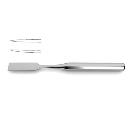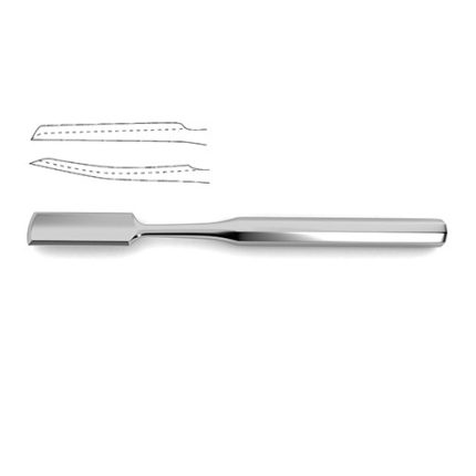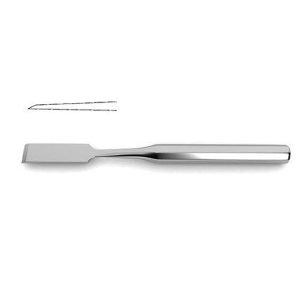 w/ calibration lines, 7-1/4" (18.4 cm)Lambotte Osteotome is designed for use in neurosurgical procedures that require manipulation of bone. This instrument is designed to be used manually to cut through bone. It offers many advantages over drills or mechanical tools such as increased sensitivity to adjust the level of force. Additionally this osteotome has the added benefit of featuring calibration lines. This osteotome is available in twelve widths in a straight profile as well as two widths in a curve profile. A full set of ten featuring straight and curved profiles is also available.