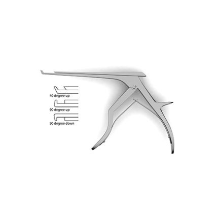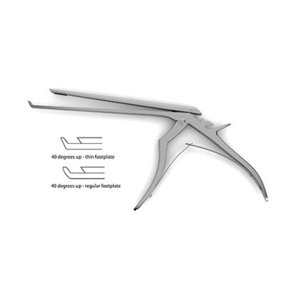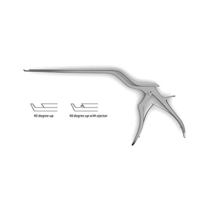 undefined?Bi-Color Ceramic Cut Micro Kerrison Detachable Rongeurs feature a swing style shaft which opens up to allow easy cleaning of the shaft interior. Once the thumb release lever above the handle is depressed, the top portion of the cutting shaft unlocks and is able to be swung open, though it remains hinged. This prevents the risk of loss through separate parts. Bi-Color rongeurs feature a combination black and gold titanium nitride surface treatment, which hardens and protects the instrument body and cutting surface for a durable, smooth gliding action. These coated rongeurs do not need sharpening as often as traditional rongeurs, thus reducing operating costs and enhancing service life. The rongeur is a specialized instrument ideally suited for use in laminectomy procedures. It features small handles and thin footplate and is 40 degrees up which allows it to comfortably maneuver in the narrow spaces in and around the vertebral column. Laminectomies are performed for a number of reasons. Some include increased access to a particular region of the spinal cord by removing the vertebral arch of a series of vertebrae or to reduce pressure on a particular portion of the vertebral column. This instrument is available in 7", 8" or 9" as well as in a variety of bite widths and with or without an ejector making it highly versatile and well suited for a number of surgical scenarios.