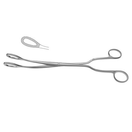 serrated, 14.0 mm jaws, curved, 9-1/2" (24.0 cm)?McClintock Placenta Forceps are ideal for removal of the placenta after the mother has given birth. The serrated teeth on the curved jaws allow for a firm grasp on the placental tissue. The ring handles allow the obstetrician to operate the instrument comfortably and with ease.