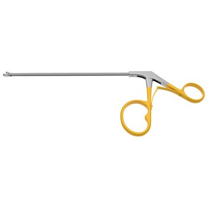 curved to side, w/ pin in upper jaw to hold specimen, 8-1/4" (21.0 cm) ?Gellhorn Uterine Biopsy Forceps feature handles angled to the side and a circular biopsy punch with a pin in the upper jaw to hold the specimen after removal. The angled ring handles allow the surgeon to perform the biopsy without obstructing the view with hands.
