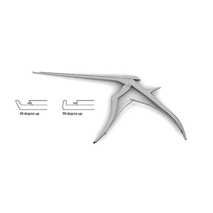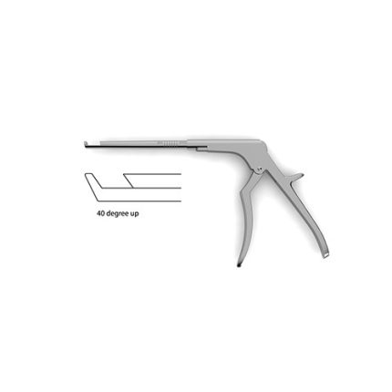 40 degrees up, small handles, 9.0 mm opening, thin footplate Fully Detachable Rongeurs feature a fully-removable shaft to ensure no debris remain in the interior of the instrument after cleaning and sterilization. The instrument can be easily disassembled and reassembled in just a few seconds. By pushing the release button on the body, the front handle can be pulled down and the upper shaft can be pulled backwards and up to remove completely.