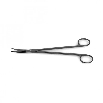 (tungsten carbide blades w/ 1 micro serrated blade), curved Ceramic Cut Gorney Scissors are often used for dissecting in plastic surgery procedures. The tungsten carbide blades are semi-sharp on the outer edges and micro serrated on the inner edges. The black ceramic coating ensures a smooth cutting action with reduced friction. The instrument is available in several lengths. Ceramic cut scissors are the highest-performing line of scissors Medicrest Surgical Industries offers. These scissors, combine the performance and precision of supercut with the durability of tungsten carbide cutting edges. In addition, the entire instrument is coated with a black ceramic finish which provides the highest surface hardness of all scissor models and results in a supremely durable instrument. The black ceramic coating is designed to reduce the friction between metal surfaces and provide surgeons with a smooth, steady cutting action. The black finish also reduces glare under operating room lights.