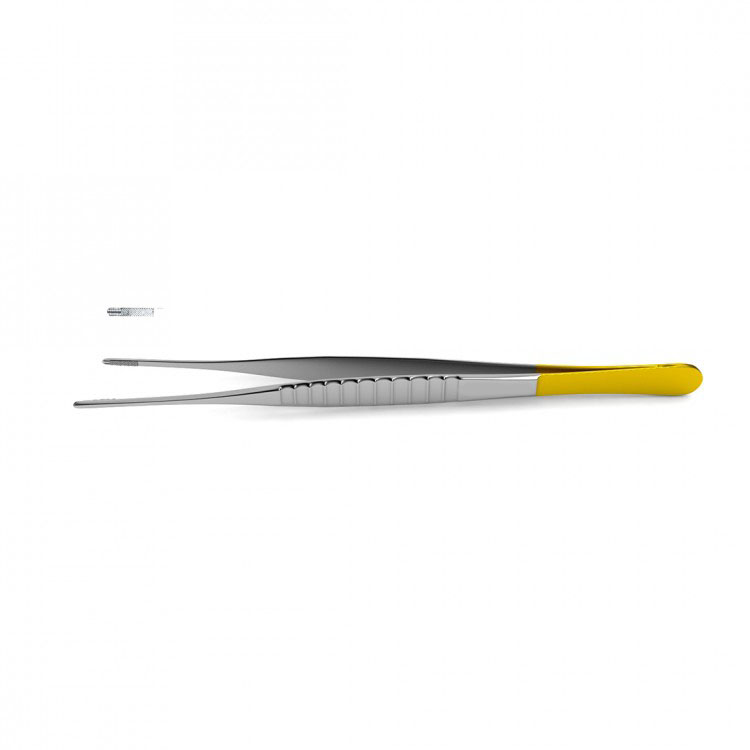 DeBakey Vascular Tissue Forceps are handcrafted from tungsten carbide for a durable and strong instrument with a crosshatched surface to provide a secure grip. Available with either 1.5 mm or 2.0 mm tips and a variety of lengths, this instrument is ideal for delicate, cardiovascular procedures and atraumatic tissue manipulation. Tungsten carbide forceps feature tips made from tungsten carbide, the hardest metal made for surgical instruments. Precision-milled serrations are formed onto the tungsten carbide inserts, resulting in pyramid-shaped teeth that provide a non-slip grip. Pyramid-shaped teeth align perfectly with each other to provide a durable and reliable grasp of the most delicate or toughest tissues, as well as needles, sutures, dressing materials and delicate vessels. Smooth tungsten carbide inserts are also available for delicate procedures. Spring tension allows for surgeons to maintain proper and consistent position, ensuring optimal grip without having to apply excess force. These forceps feature gold-plated handles.