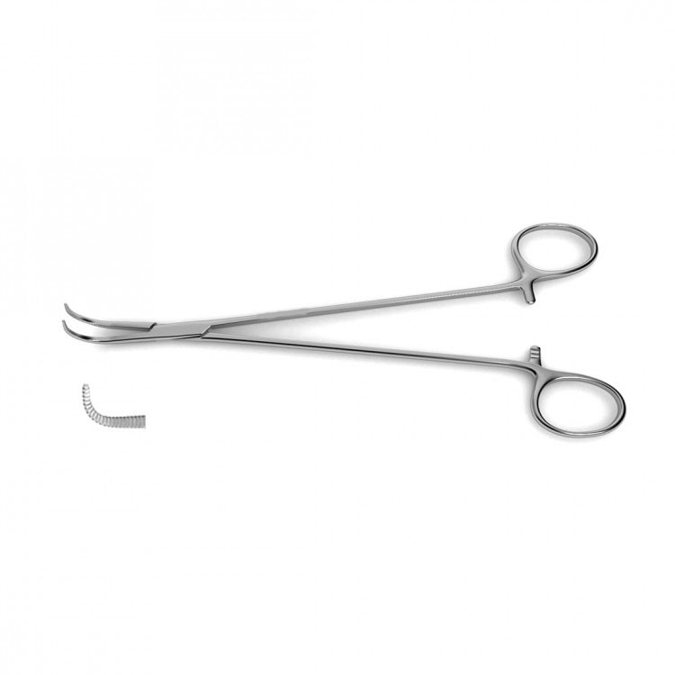 Dietrich Clamp is 4 ?” and contains serrated jaws that are curved at a right angle that can help to grasp blood vessels that are harder to reach. This clamp provides a secure method of occluding blood flow to smaller vessels due to its locking mechanism on the inner part of the ring-handles. The ratchet device allows for a precise grasp and can easily be positioned onto the end of a vessel.