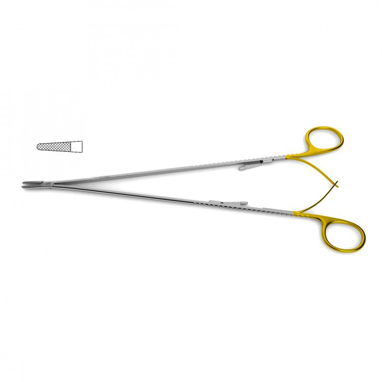 Castroviejo Heavy Needle Holder - Tungsten Carbide?straight w/ lock (use w/ 1-0, 2-0 & 3-0 suture) Castroviejo Heavy Needle Holder is handcrafted from German stainless steel and tungsten carbide inserts that provides control, precision and a dependable non-slip crosshatched surface. For use with 1-0, 2-0, and 3-0 sutures, this heavy model is designed with a lock. The slender design of the needle holder allow for use when suturing in more distal areas. Tungsten carbide needle holders provide unparalleled control while suturing. The precision-milled, pyramid-shaped teeth ensure a dependable, non-slip surface. Some needle holder styles are also available with smooth tungsten carbide jaws, designed to hold the smallest sutures in microsurgical and plastic surgery procedures. Tungsten carbide jaws are inherently more durable than stainless steel and clinicians will experience an extended service-life. These needle holders feature gold-plated handles.