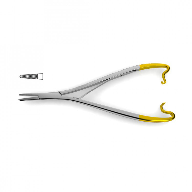 Mathieu Needle Holder is handcrafted from German stainless steel and tungsten carbide inserts that provides control, precision and a dependable non-slip crosshatched surface. Designed with serrated jaws, scissor action and palm-held handles, this instrument ensures a snug grip on the needle and maximum control by the surgeon. Tungsten carbide needle holders provide unparalleled control while suturing. The precision-milled, pyramid-shaped teeth ensure a dependable, non-slip surface. Some needle holder styles are also available with smooth tungsten carbide jaws, designed to hold the smallest sutures in microsurgical and plastic surgery procedures. Tungsten carbide jaws are inherently more durable than stainless steel and clinicians will experience an extended service-life. These needle holders feature gold-plated handles.