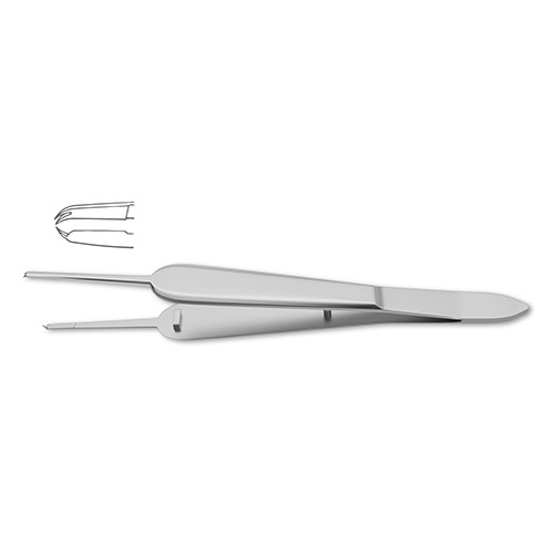 round handle, 6.0 mm platform w/ cross-serrations at tip, 4-1/2" (11.4 cm)Catalano Micro Tying Forceps are an ideal tool during ophthalmologic procedures and post-operative care. The micro profile along with cross serrations are ideal for gripping suturing equipment as well as delicate tissue. The extended length allows access to difficult to reach areas, while the round handle is designed to reduce physician fatigue during the procedure. The forceps are available angled or straight depending on surgeon preference.