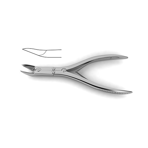 angled handle, straight 17.0 mm jaws, 7" (18.0 cm)Goldman-Kazanjian Rongeur is a specialized instrument for use in handling of small bones and other bony tissue layers. The jaws of this instrument are 17.0 mm and straight making them well suited for quick, precise cuts across bony plains or small bones. Additionally the angled handles allows the cutting surface to remain parallel to the instrument while the handle is offset to make it comfortable to grip and maneuver for the surgeon.
