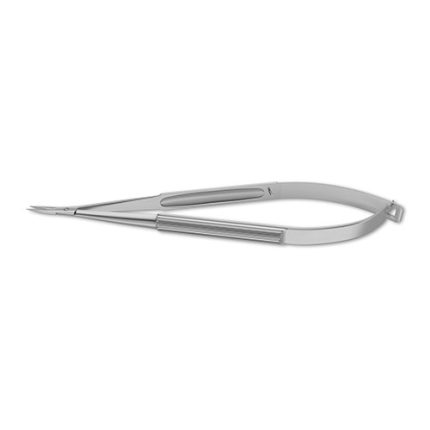 w/ out lock, delicate, round fenestrated handles, curved jaws, 4-1/8" (10.5 cm)?Micro Needle Holder is a commonly used tool in postoperative management of ophthalmologic procedures. Particularly, the holder is designed for handling fine monofilament suturing material for delicate would closure. Two different jaw sizes are available with the holder depending on surgical preference.