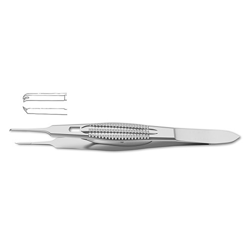 0.12 mm angled 45 degrees, 6.0 mm tying platform, 4-1/8" (10.5 cm)?Colibri Type Corneal Utility Forceps are a commonly used instrument for handling the corneal tissue during keratoplasty or repair. These forceps feature fine 0.12 teeth for the manipulating delicate tissue during cornea-scleral suturing, while the 6.0 mm tying platform allows for the handling of both tissue and sterile material. Finally, a ribbed handle provides a secure grip during the procedure.