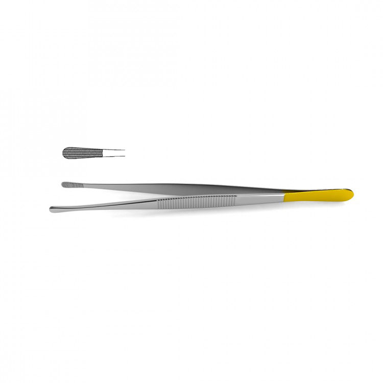 Wangensteen Tissue Forceps are handcrafted from tungsten carbide for a durable and strong instrument with a crosshatched surface to provide a secure grip. Available in three lengths, these forceps have a blunt tip and are ideal for working with dressings. Tungsten carbide forceps feature tips made from tungsten carbide, the hardest metal made for surgical instruments. Precision-milled serrations are formed onto the tungsten carbide inserts, resulting in pyramid-shaped teeth that provide a non-slip grip. Pyramid-shaped teeth align perfectly with each other to provide a durable and reliable grasp of the most delicate or toughest tissues, as well as needles, sutures, dressing materials and delicate vessels. Smooth tungsten carbide inserts are also available for delicate procedures. Spring tension allows for surgeons to maintain proper and consistent position, ensuring optimal grip without having to apply excess force. These forceps feature gold-plated handles.